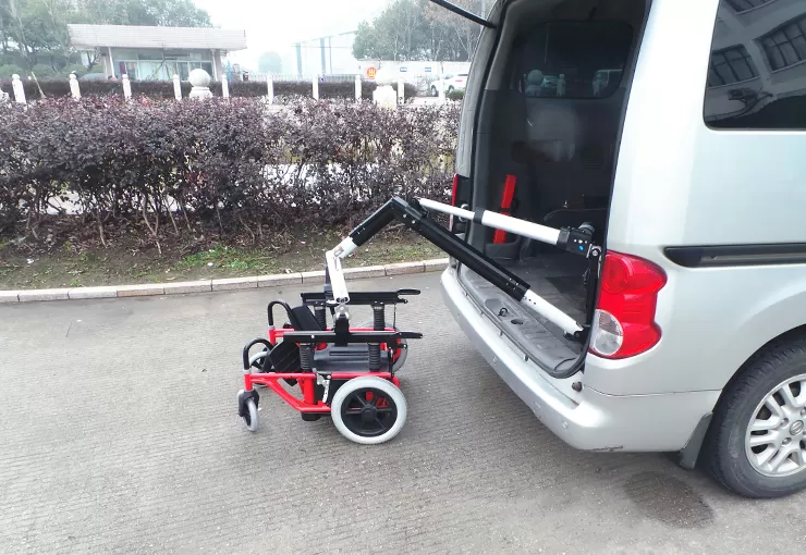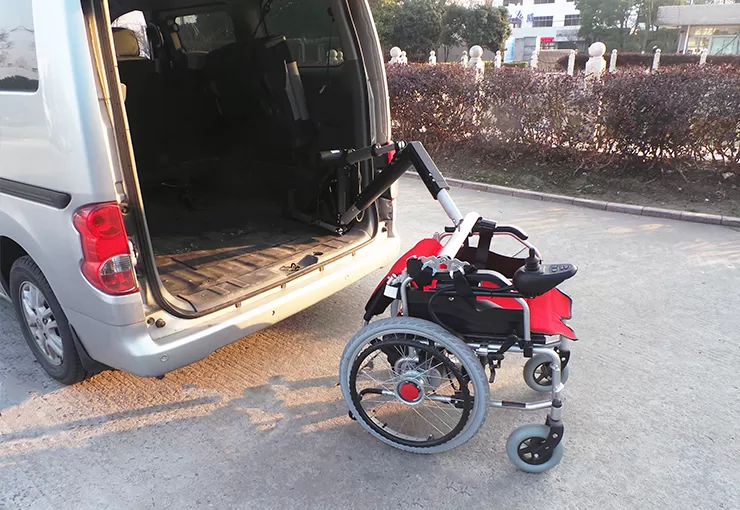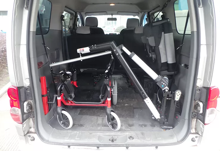 이 휠체어 호이스트는 휠체어를 트렁크에 빠르고 편리하게 들어 올리고 보관할 수있는 자동차 트렁크에 설치됩니다.